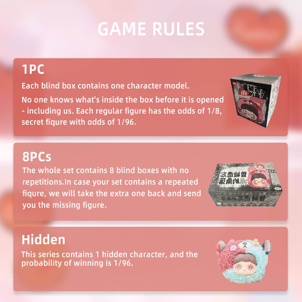 Blind Box: Blind boxes are completely random, and we do not accept requests for specific styles. The probability of opening each ordinary doll is 1/8. This series contains 1 hidden doll, and the probability of winning is 1/96. 1PC---(Each blind box contains one doll. Before opening, no one knows which model is in the box-including ourselves.)8PCs---(The whole set contains 8 blind boxes, no duplication. If your blind box contains duplicate dolls, please return the duplicate model and we will send the missing doll.)