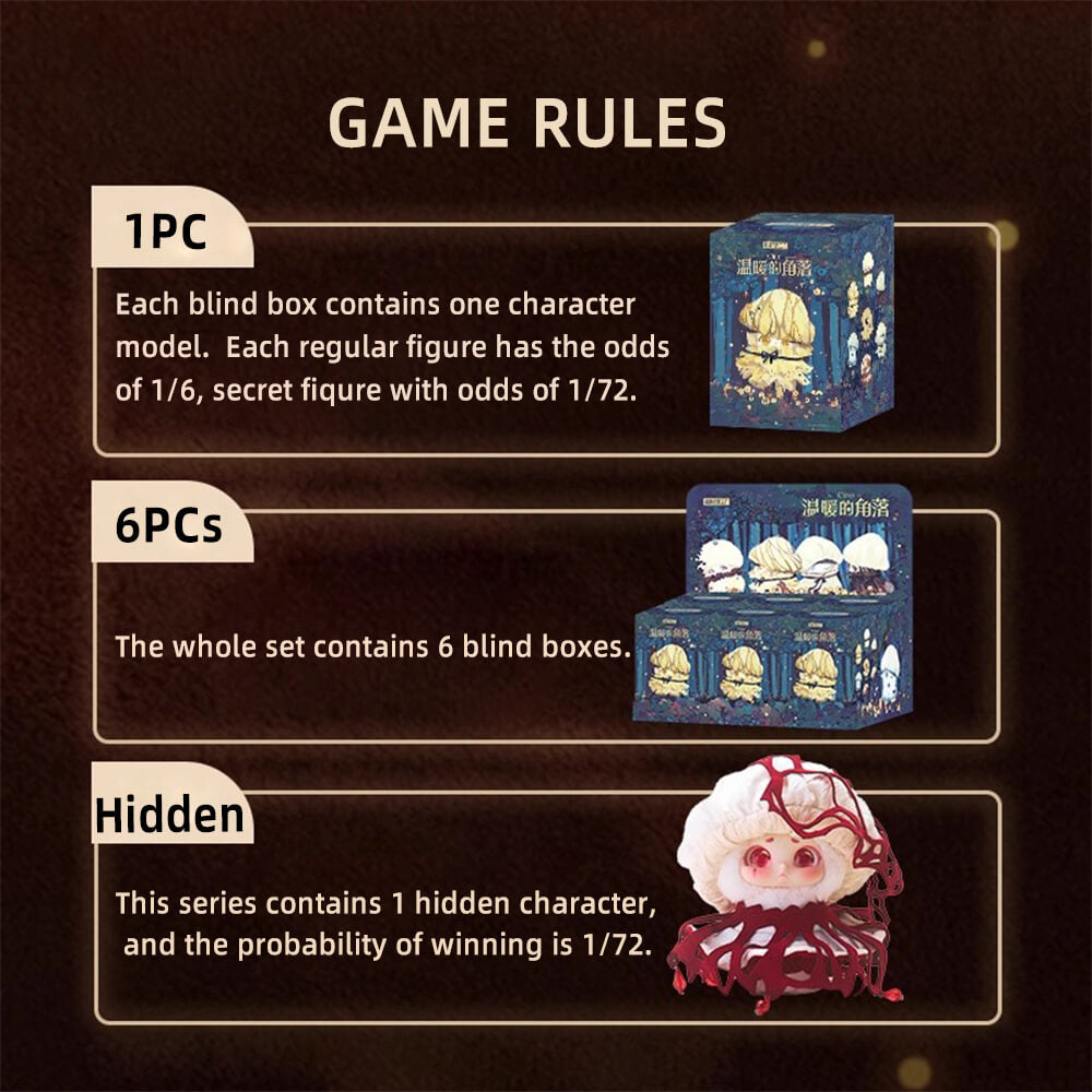Blind Box: Blind boxes are completely random, and we do not accept requests for specific styles. The probability of opening each ordinary doll is 1/6. This series contains 1 hidden doll, and the probability of winning is 1/72. 1PC---(Each blind box contains one doll. Before opening, no one knows which model is in the box-including ourselves.)6PCs---(The whole set contains 6 blind boxes, no duplication. If your blind box contains duplicate dolls, please return the duplicate model and we will send the missing doll.)