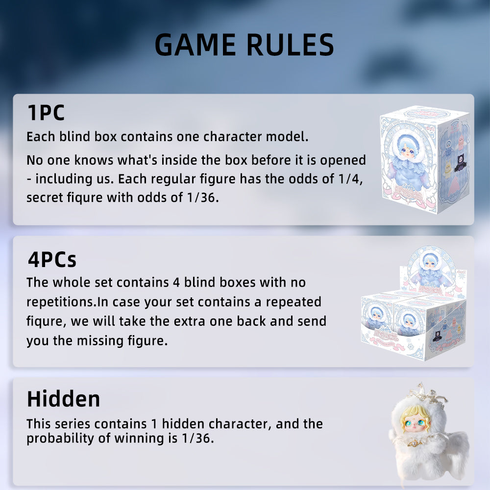 Blind Box: Blind boxes are completely random, and we do not accept requests for specific styles. The probability of opening each ordinary doll is 1/4. This series contains 1 hidden doll, and the probability of winning is 1/36. 1PC---(Each blind box contains one doll. Before opening, no one knows which model is in the box-including ourselves.)4PCs---(The whole set contains 4 blind boxes, no duplication. )