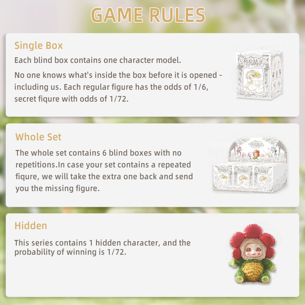Blind Box: Blind boxes are completely random, and we do not accept requests for specific styles. The probability of opening each ordinary doll is 1/6. This series contains 1 hidden doll, and the probability of winning is 1/72. Single Box---(Each blind box contains one doll. Before opening, no one knows which model is in the box-including ourselves.)Whole Set---(The whole set contains 6 blind boxes, no duplication. If your blind box contains duplicate dolls, please return the duplicate model and we will send the missing doll.)
