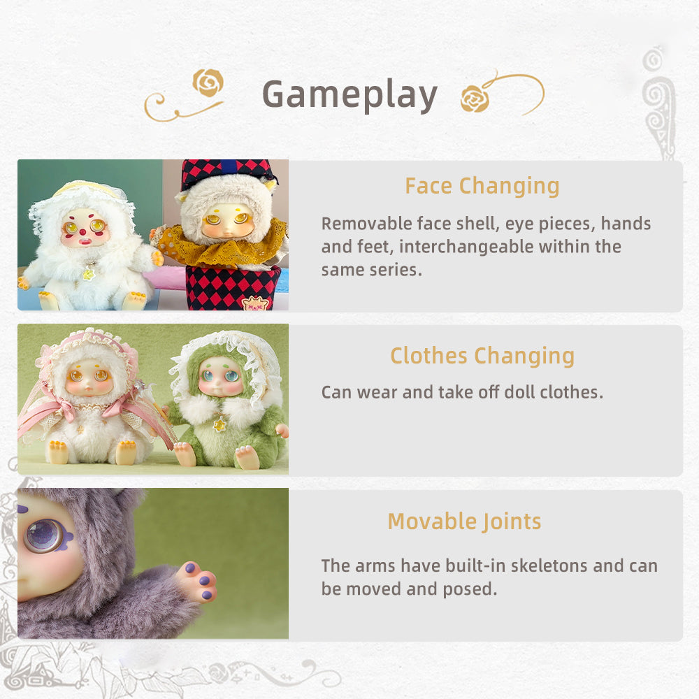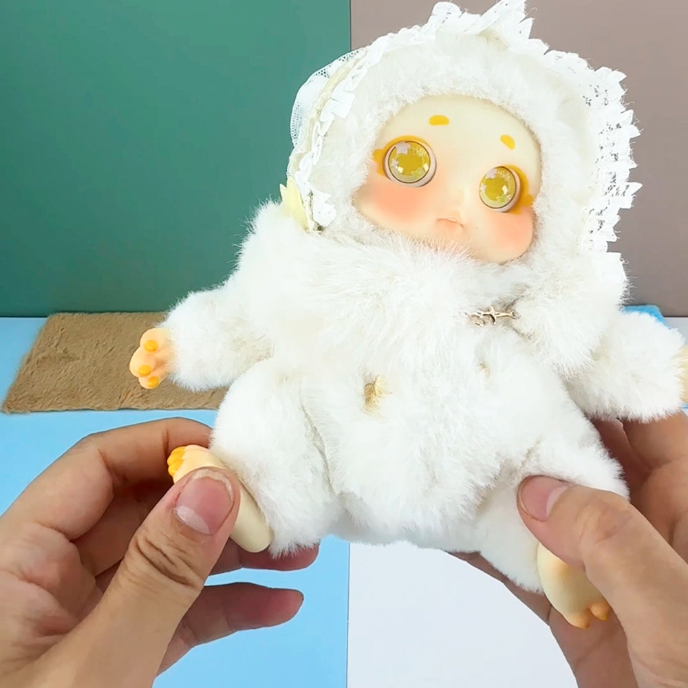 Interactive Design: The face shell, eye pieces, hands and feet are removable and interchangeable with dolls from the same series. The doll clothes can be put on and taken off . The arms have built-in bones, which can be posed in various poses, making each doll more dynamic and attractive.