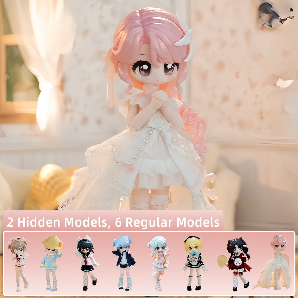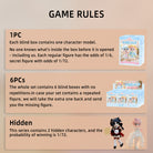 Blind Box: Blind boxes are completely random, and we do not accept requests for specific styles. The probability of opening each ordinary doll is 1/6. This series contains 1 hidden doll, and the probability of winning is 1/72. 1PC---(Each blind box contains one doll. Before opening, no one knows which model is in the box-including ourselves.)6PCs---(The whole set contains 6 blind boxes, no duplication. )
