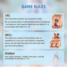 Blind Box: Blind boxes are completely random, and we do not accept requests for specific styles. The probability of opening each ordinary doll is 1/6. This series contains 1 hidden doll, and the probability of winning is 1/72. 1PC---(Each blind box contains one doll. Before opening, no one knows which model is in the box-including ourselves. If you order multiple 1PCs, you may receive duplicate items.). 6PCs---(The whole set contains 6 blind boxes, no duplication. )