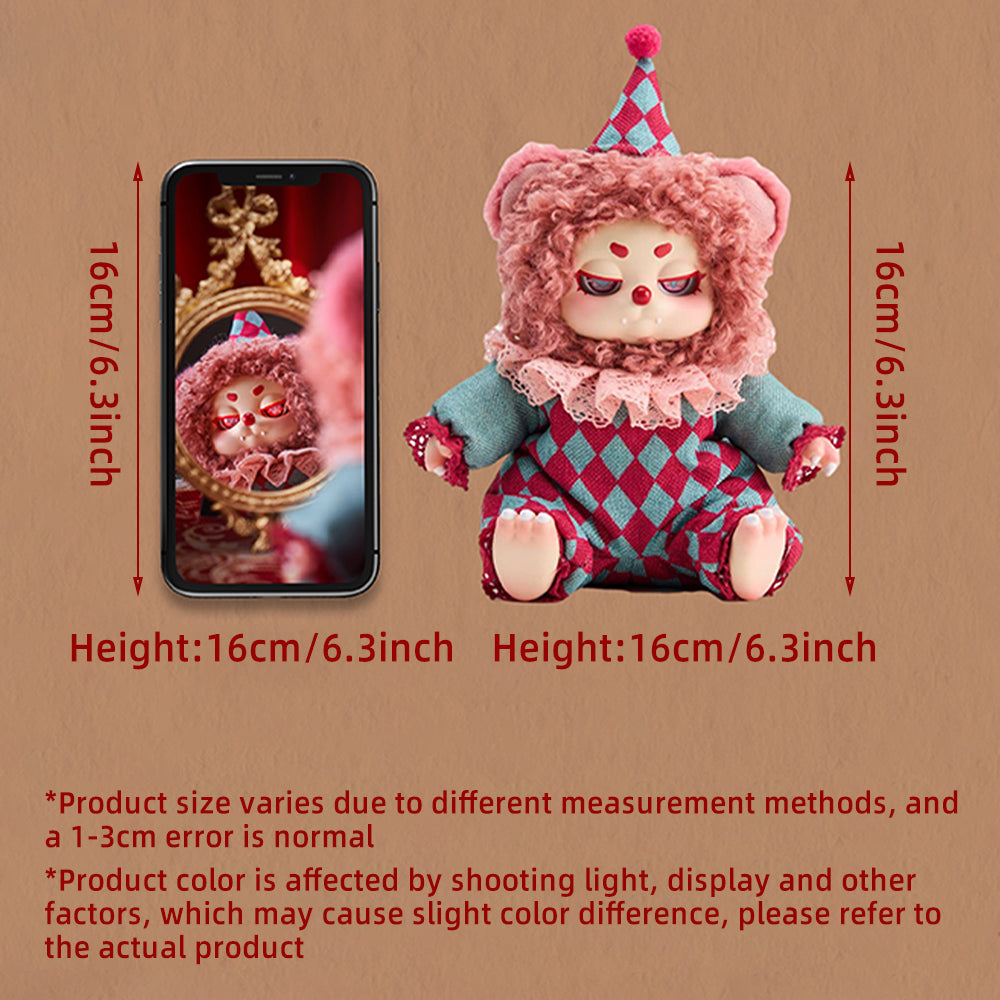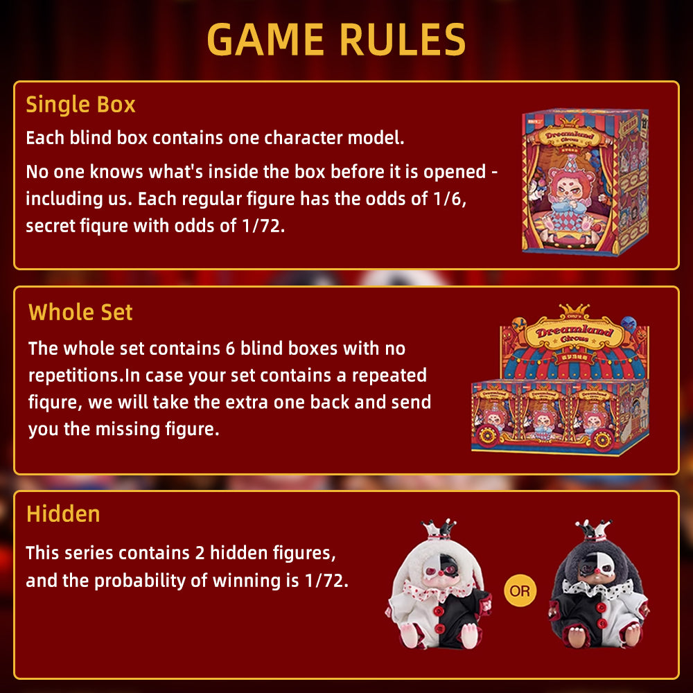 Blind Box: Blind boxes are completely random, and we do not accept requests for specific styles. The probability of opening each ordinary doll is 1/6. This series contains 2 hidden dolls, and the probability of winning is 1/72. Single Box---(Each blind box contains one doll. Before opening, no one knows which model is in the box-including ourselves.)Whole Set---(The whole set contains 6 blind boxes, no duplication. If your blind box contains duplicate dolls, please return the duplicate model and we will send the missing doll.)
