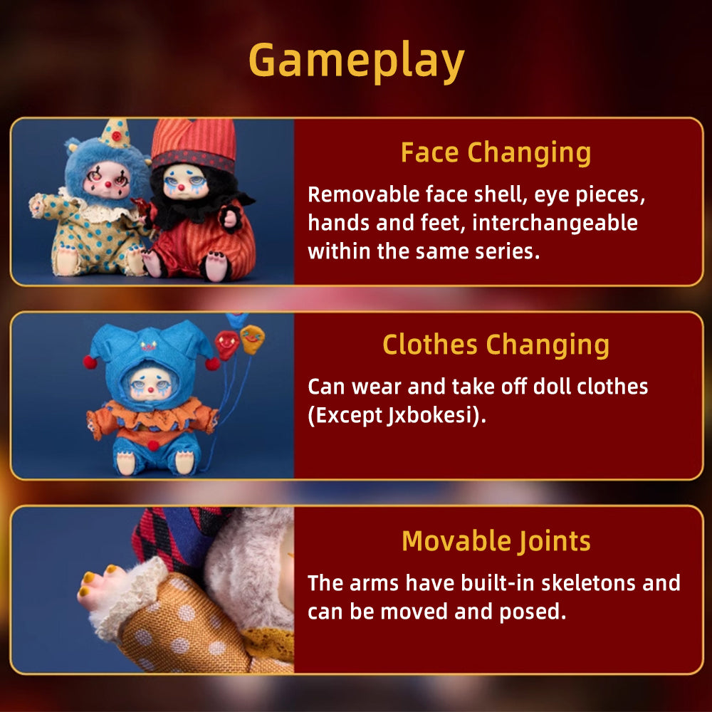Interactive Design: The face shell, eye pieces, hands and feet are removable and interchangeable with dolls from the same series. The doll clothes can be put on and taken off (Except Jxbokesi). The arms have built-in bones, which can be posed in various poses, making each doll more dynamic and attractive.