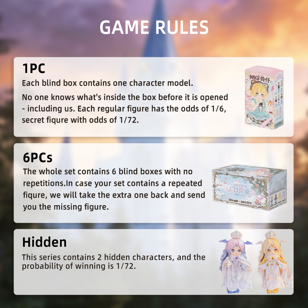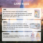 Blind Box: Blind boxes are completely random, and we do not accept requests for specific styles. The probability of opening each ordinary doll is 1/6. This series contains 2 hidden dolls, and the probability of winning is 1/72. 1PC---(Each blind box contains one doll. )6PCs---(The whole set contains 6 blind boxes, no duplication.)