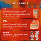 Blind Box: Blind boxes are completely random, and we do not accept requests for specific styles. The probability of opening each ordinary doll is 1/6. This series contains 2 hidden dolls, and the probability of winning is 1/188. 1PC---(Each blind box contains one doll. Before opening, no one knows which model is in the box-including ourselves.)6PCs---(The whole set contains 6 blind boxes, no duplication. )