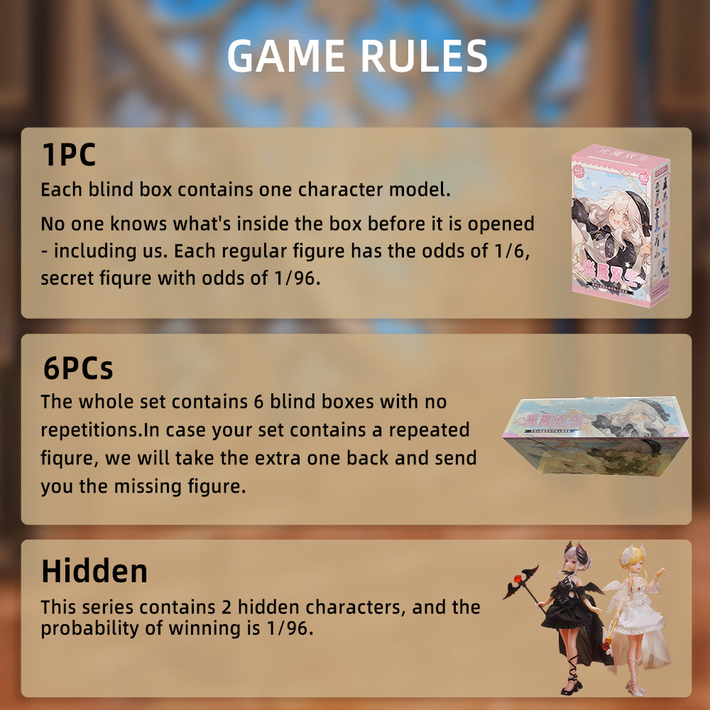 Blind Box: Blind boxes are completely random, and we do not accept requests for specific styles. The probability of opening each ordinary doll is 1/6. This series contains 2 hidden dolls, and the probability of winning is 1/96. 1PC---(Each blind box contains one doll. )6PCs---(The whole set contains 6 blind boxes, no duplication.)