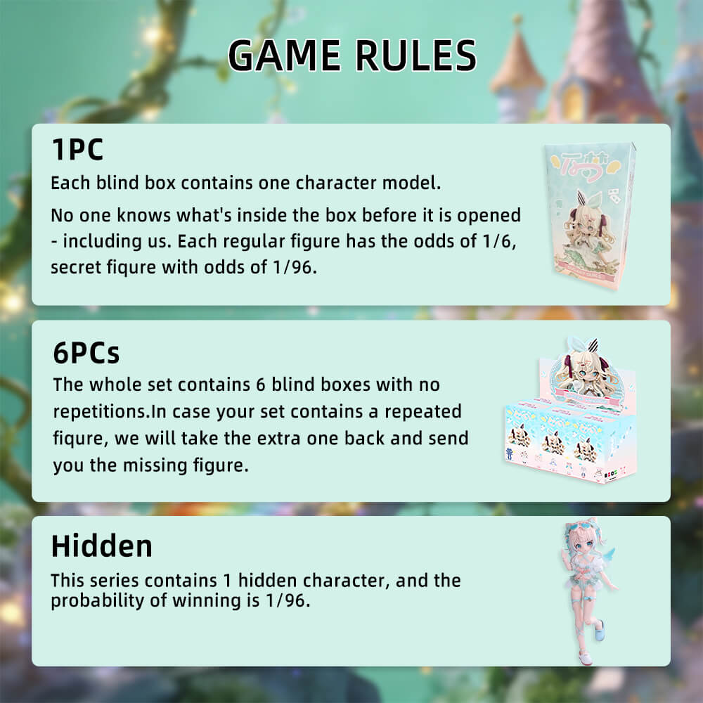 Blind Box: Blind boxes are completely random, and we do not accept requests for specific styles. The probability of opening each ordinary doll is 1/6. This series contains 1 hidden doll, and the probability of winning is 1/96. 1PC---(Each blind box contains one doll. )6PCs---(The whole set contains 6 blind boxes, no duplication.)