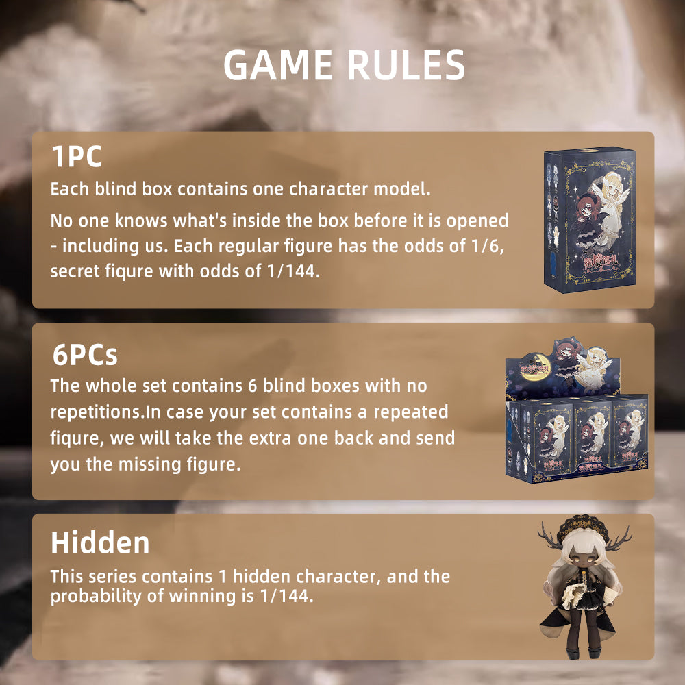 Blind Box: Blind boxes are completely random, and we do not accept requests for specific styles. The probability of opening each ordinary doll is 1/6. This series contains 1 hidden doll, and the probability of winning is 1/144. 1PC---(Each blind box contains one doll. )6PCs---(The whole set contains 6 blind boxes, no duplication.)