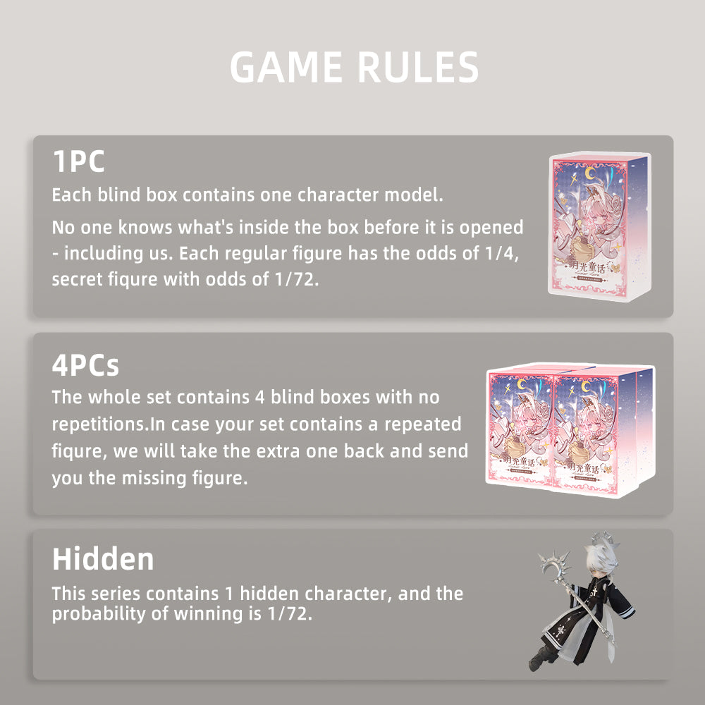 Blind Box: Blind boxes are completely random, and we do not accept requests for specific styles. The probability of opening each ordinary doll is 1/4. This series contains 1 hidden doll, and the probability of winning is 1/72. 1PC---(Each blind box contains one doll. )4PCs---(The whole set contains 4 blind boxes, no duplication.)